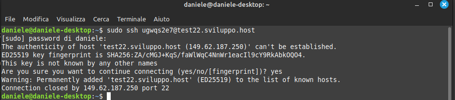 sudo ssh ugwqs2e7@test22.sviluppo.host – dove la parte iniziale è la user FTP e “test22.sviluppo.host” è il nome del nostro sito web.