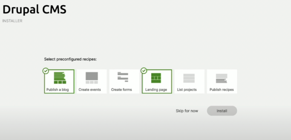 Durante la fase di installazione semplificata ci chiederà di iniziare con una configurazione già prestabilita che preparerà un kit di moduli, contenuti, etc adatti ai nostri obiettivi. In pratica sono già le “Recipes” che poi in seguito potremo ulteriormente sviluppare.