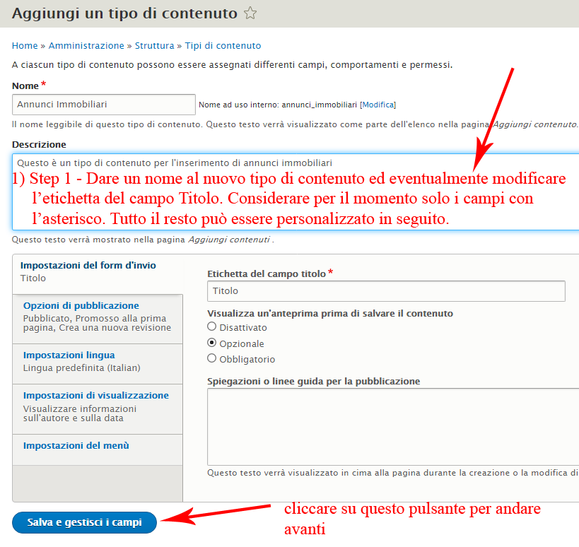 Dunque dobbiamo creare un tipo di contenuto adatto all’Agenzia immobiliare per l’inserimento dei contenuti (i dati) cioè degli annunci immobiliari. Come si traduce tutto questo nel linguaggio di Drupal?Cioè come si fa a creare praticamente un Tipo di Contenuto per l’inserimento dei dati all’interno del CMS?
