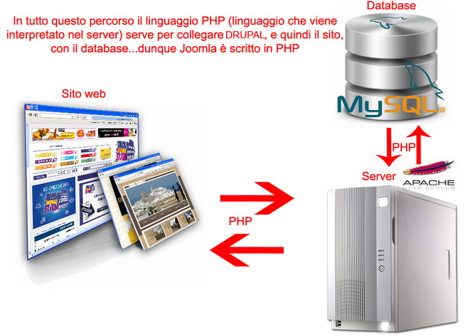 Nei cms serve per produrre pagine dinamiche cioè elaborate dal server e non dal computer dell’utente come avviene per HTML o Javacript interagendo con il database MySql che possiamo considerare come un grosso magazzino dove sono contenute tutte le informazioni del sito web.