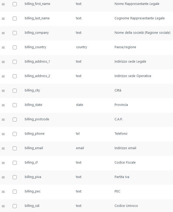 Il nome dei campi è stato prelevato dal Plugin “Checkout Fiedl Editor For Woocommerce”.