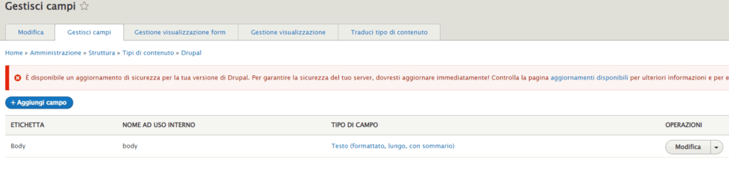 Dalla Dashboard di Drupal CMS, l’interfaccia si presenta con un pannello di controllo sulla sinistra, offrendo un’esperienza di navigazione più intuitiva. La versione base è in inglese, ma è possibile tradurre l’interfaccia in italiano direttamente dalle impostazioni.