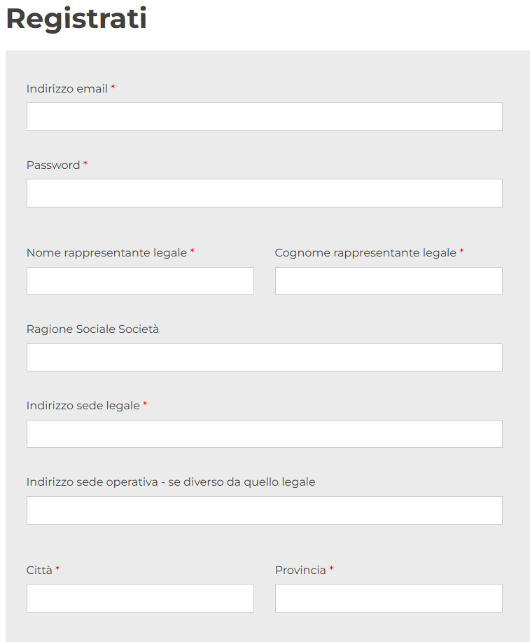 Installato il Plugin Possiamo estendere i campi di Woocommerce a livello di Form Fiscale. Il committente ha bisogno di un Form di registrazione di questo tipo: